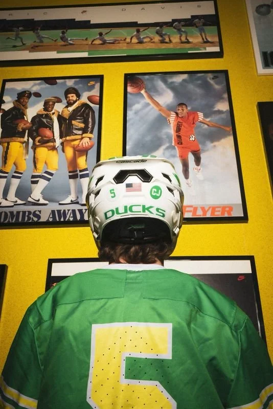 For this uniform reveal, we visited the Graduate Hotel in Eugene. With its signature Nike posters and Nike-themed accents, we were able to capture the Oregon essence of the hotel, while showcasing our most “Oregon” uniform combination of green and yellow.